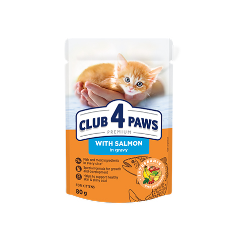 Club 4 Paws Pouch Premium Cat Kitten with Salmon in Gravy 80гр. - Пълноценна консервирана храна за малки котенца с сьомга