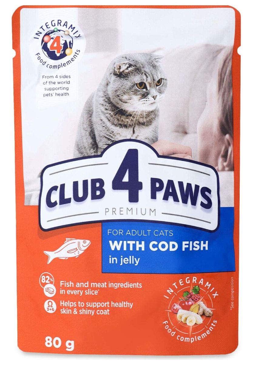 Club 4 Paws Pouch Premium Adult Cat with Cod Fish in Jelly 80гр. - Пълноценна консервирана храна за възрастни котки с Треска в желе