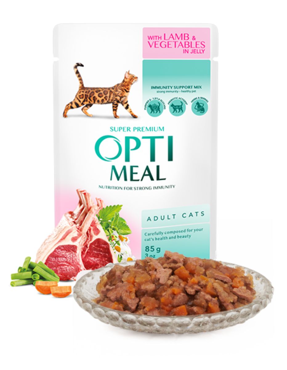 Optimeal Pouch Adult Cat with Lamb and Veggies in Jelly (0.85kg) - Пълноценна консервирана храна за котенца (Пауч) с агнешко и зеленчуци в желе