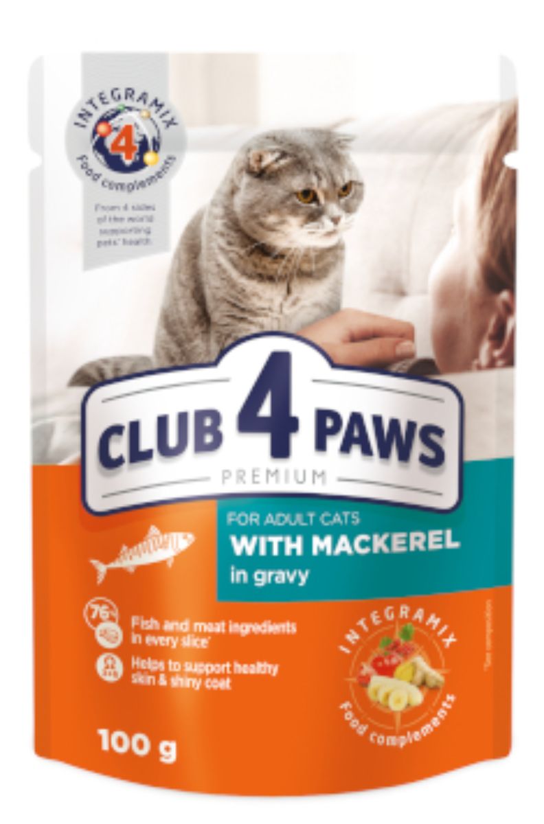 Club 4 Paws Pouch Premium Adult Cat with Mackerel in Gravy Sause 100гр. - Пълноценна консервирана храна за възрастни котки със Скумрия в сос