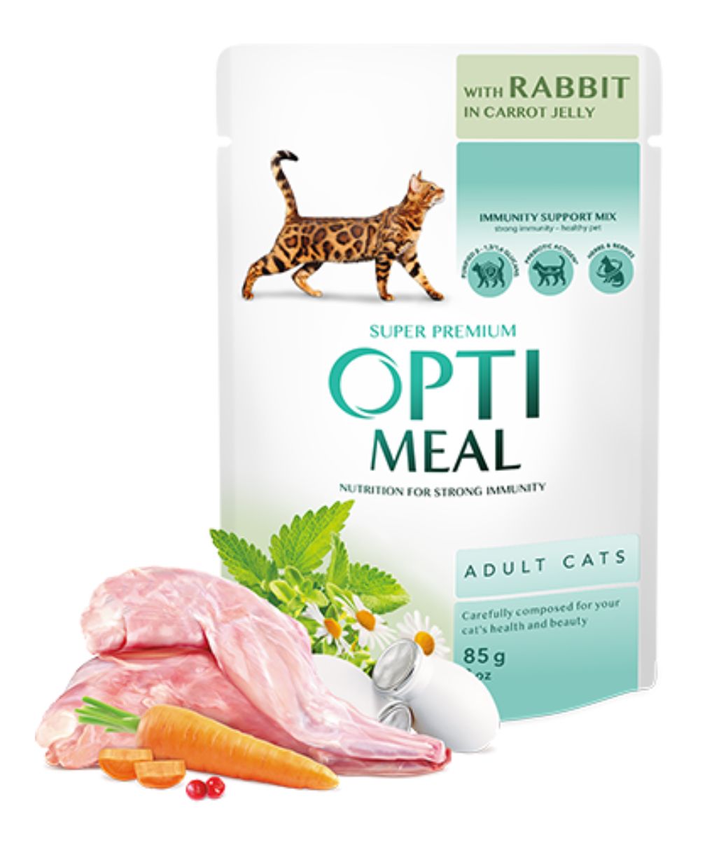 Optimeal Pouch Adult Cat with Rabbit in Carrot Jelly (0.085kg) - Пълноценна консервирана храна за възрастни котки (Пауч) със заешко в желе от моркови