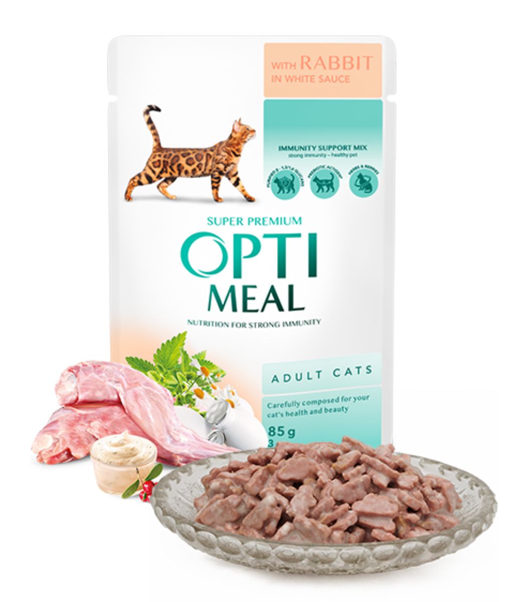Optimeal Pouch Adult Cat with Rabbit in White Sauce (0.85kg) - Пълноценна консервирана храна за възрастни котки (Пауч) със Заешко в Бял сос
