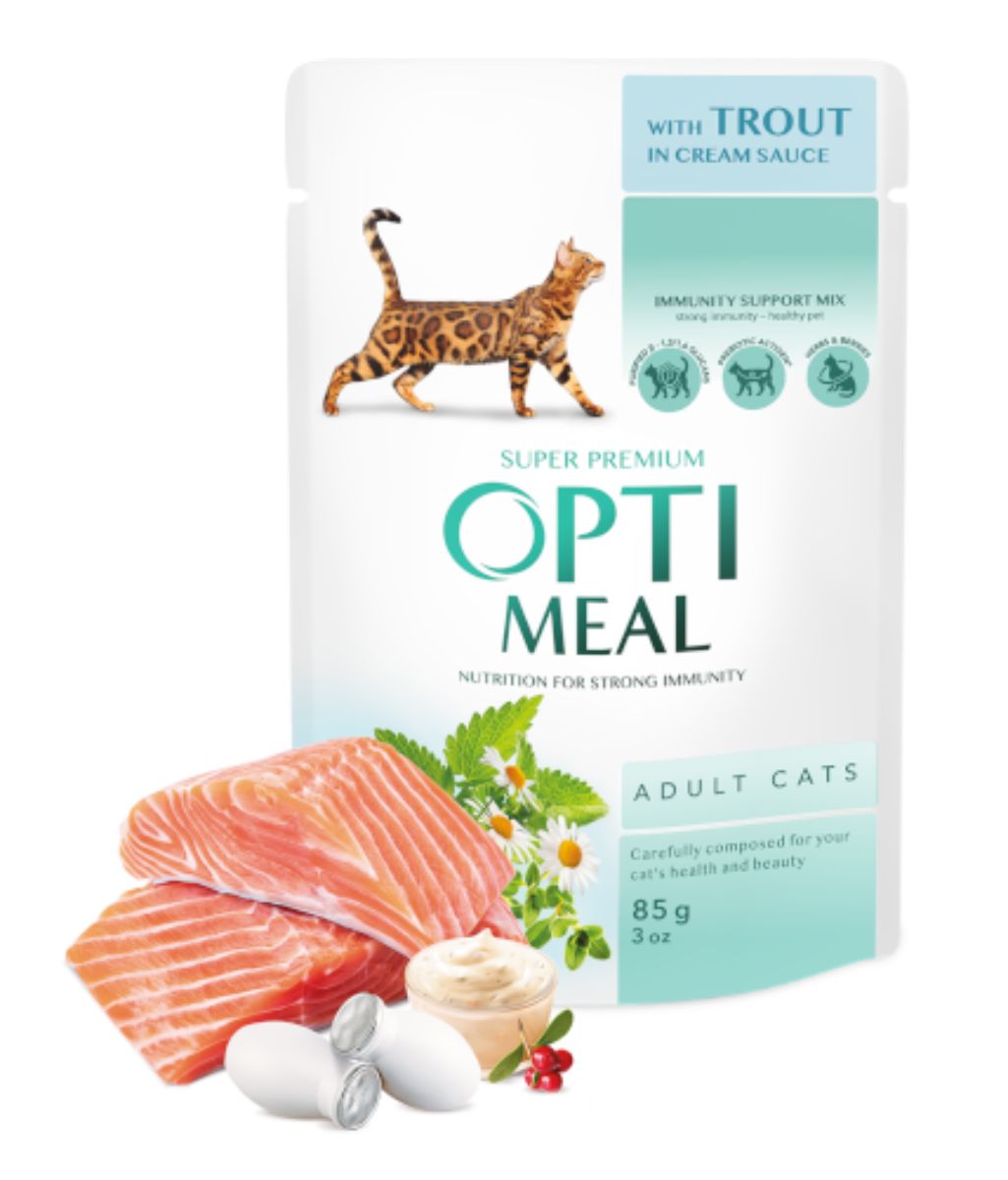 Optimeal Pouch Adult Cat with Trout in Cream Sauce (0.85kg) - Пълноценна консервирана храна за възрастни котки с пъстърва в сметанов сос