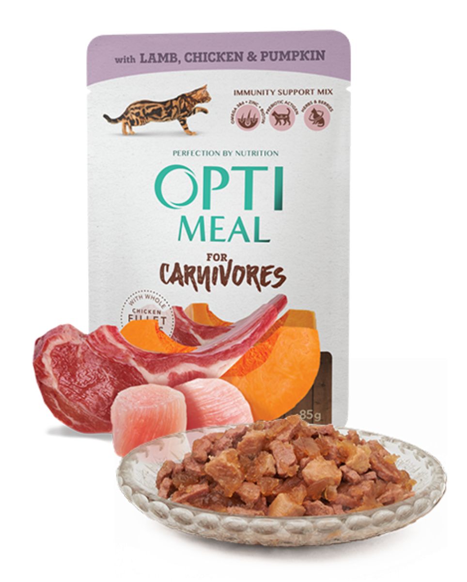 Optimeal Pouch Adult Cat Grain Free with Lamb/Chicken Fillet/Pumpkin 0.085 - Пълноценна консервирана храна за възрастни котки с агнешко и пилешко филе желе от тиква