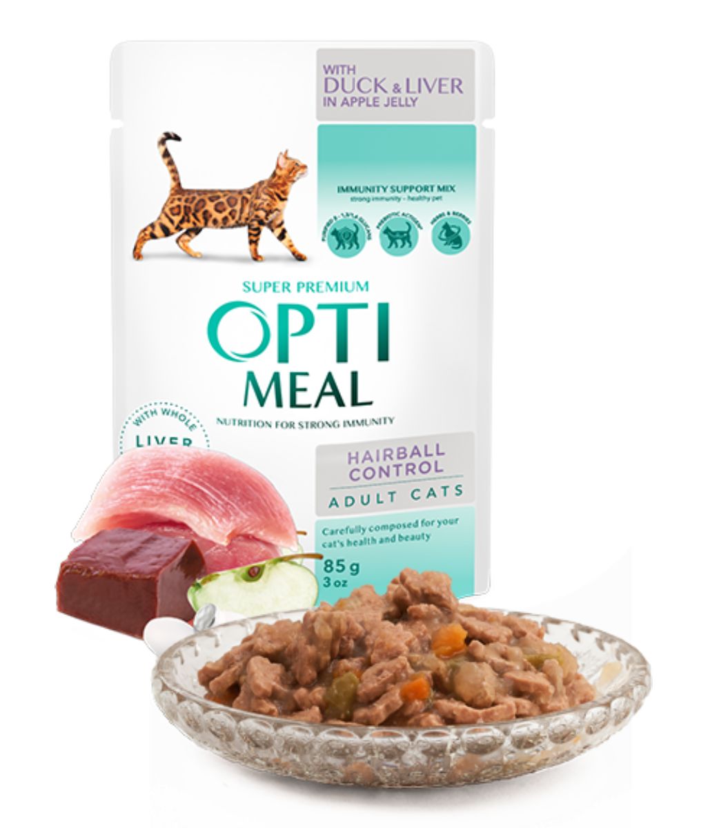 Optimeal Pouch Adult Cat Hairball Control with Duck and Slices of Liver in Apple Jelly 0.085kg - Пълноценна консервирана храна за възрастни котки с парченца черен дроб в ябълково желе