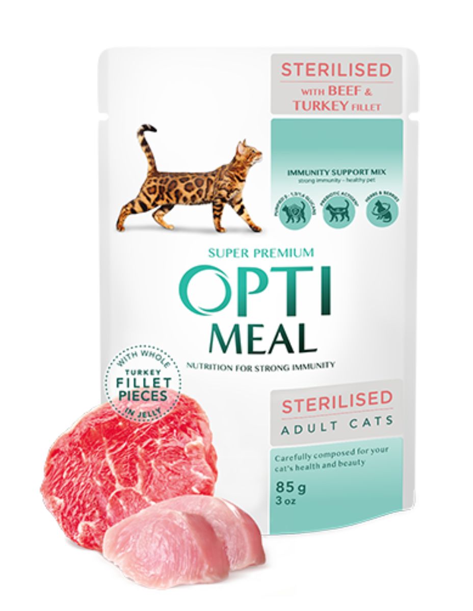 Optimeal Pouch Adult Cat Sterilised with Beef and Turkey Fillet in Jelly 0.085kg - Пълноценна консервирана храна (Пауч) за стерилизирани котки с телешко и пуешко филе в желе