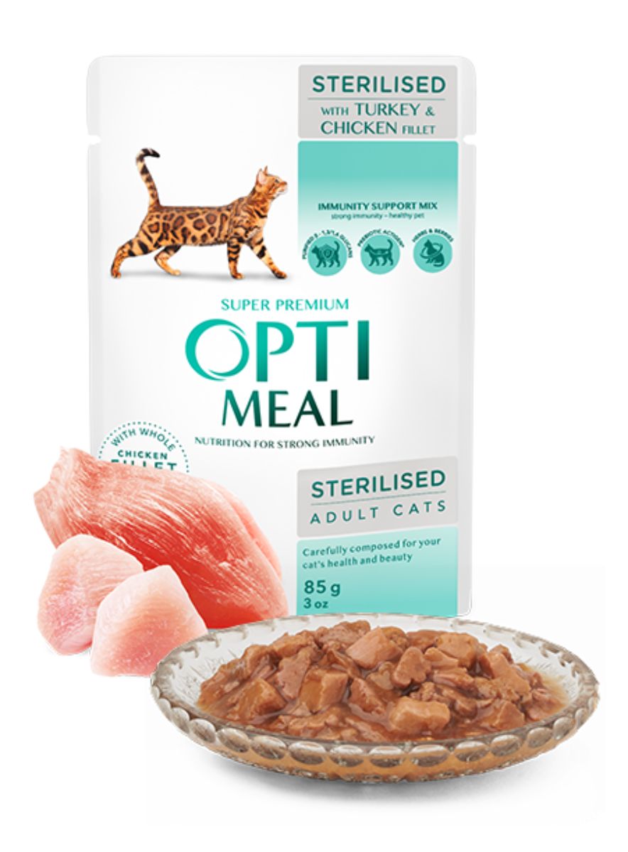 Optimeal Pouch Adult Cat Sterilised with Turkey/Chicken Fillet 0.085kg - Пълноценна консервирана храна за възрастни котки с пуешко и пилешко филе в сос