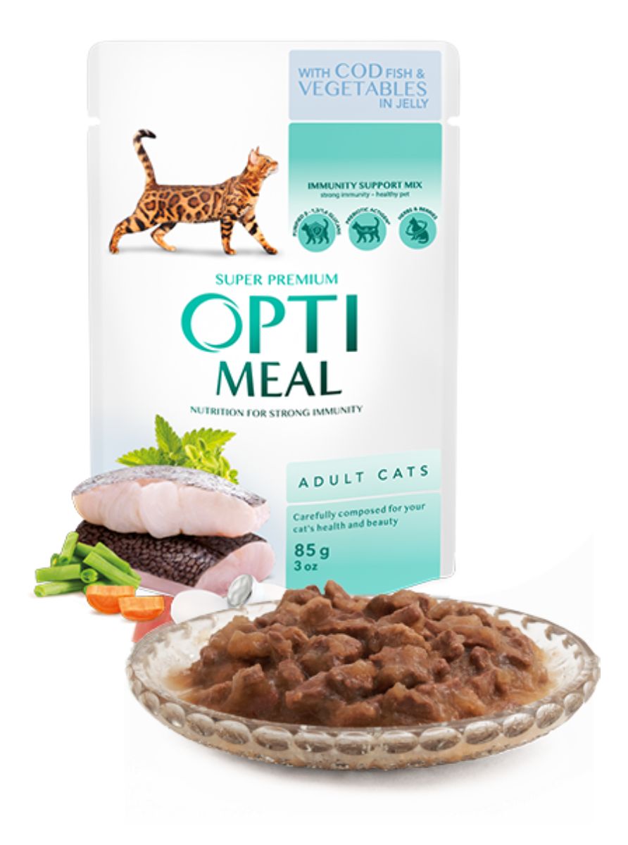 Optimeal Pouch Adult Cat with Cod Fish and Veggies in Jelly (0.085kg) - Пълноценна консервирана храна за възрастни котки (Пауч), с риба Треска и Зеленчуци в желе