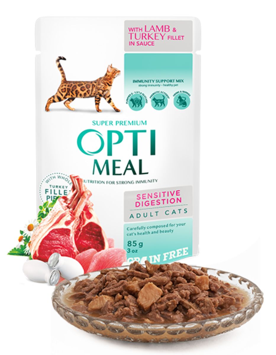 Optimeal Pouch Adult Cat Grain Free Sensitive Digestion with Lamb and Turkey Fillet in Sauce (0.085 kg) - Пълноценна консервирана храна (Пауч) за възрастни котки с пуешко и пилешко филев сос