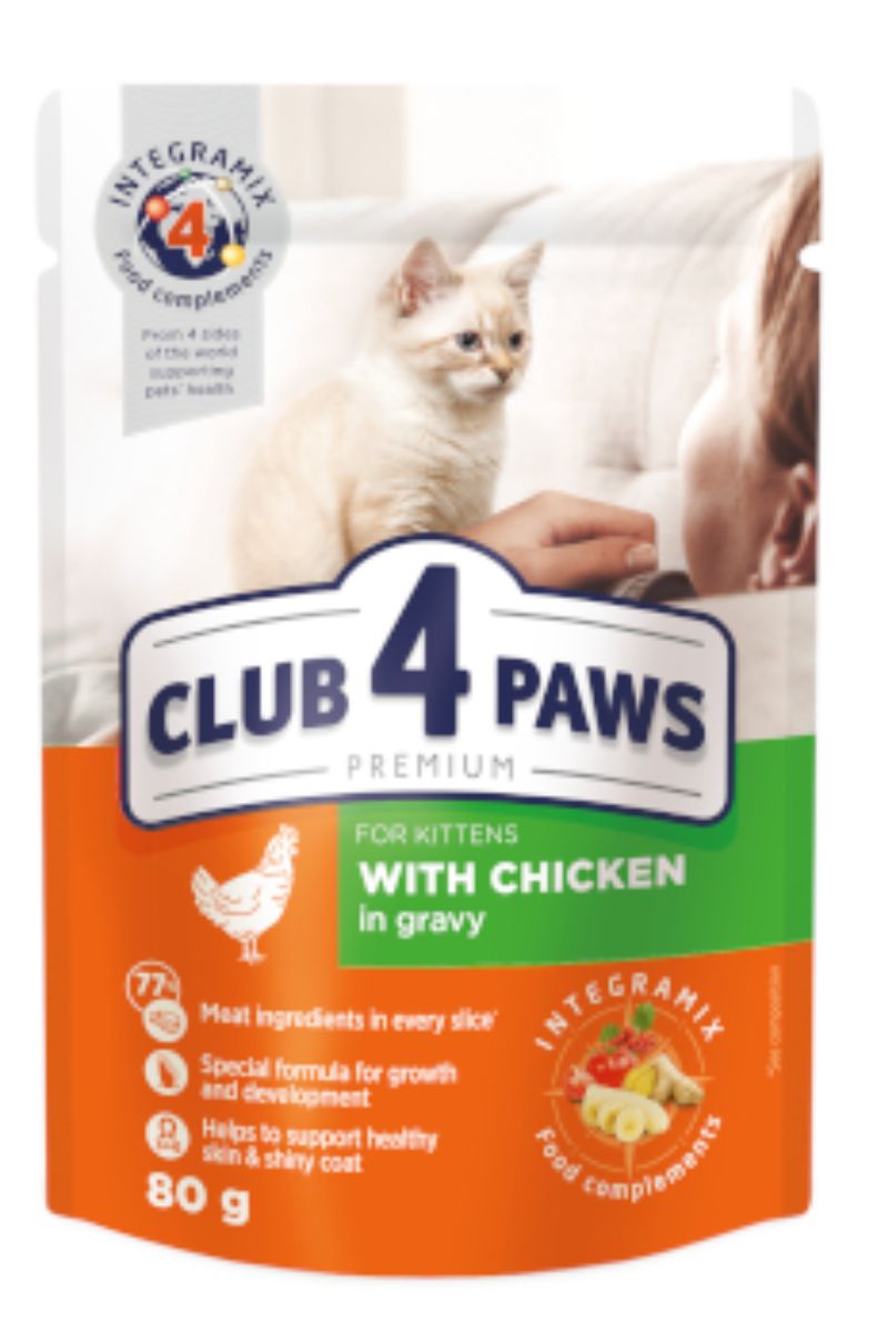 Club 4 Paws Pouch Premium Cat Kitten with Chicken in Gravy 80гр. - Пълноценна консервирана храна за малки котенца с Пиле в сос