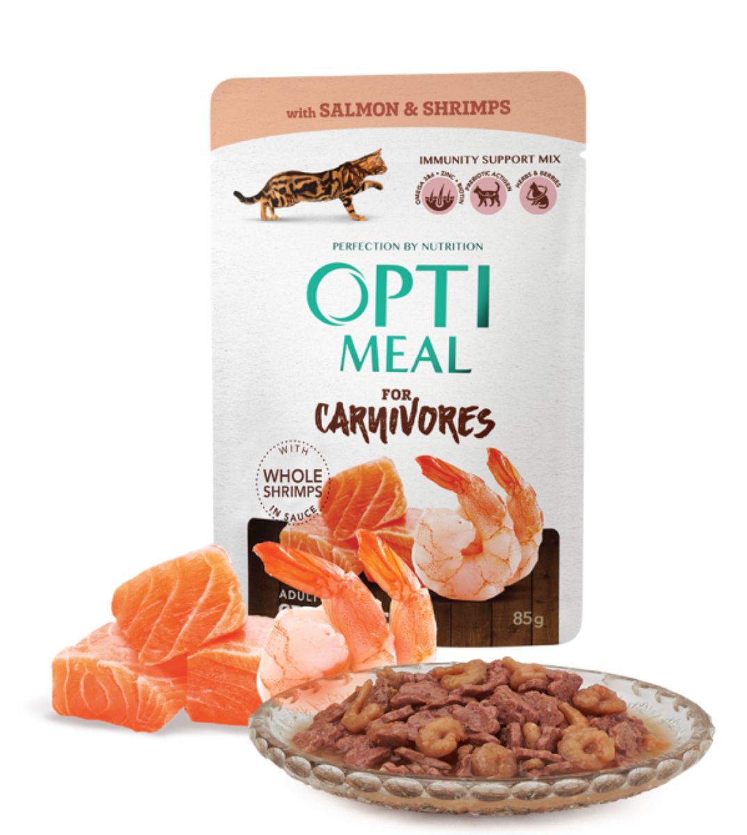 Optimeal Pouch Adult Cat Grain Free with Salmon/Shrimps 0.085kg - Пълноценна консервирана храна за възрастни котки (Пауч) със Сьомга и скариди в сос
