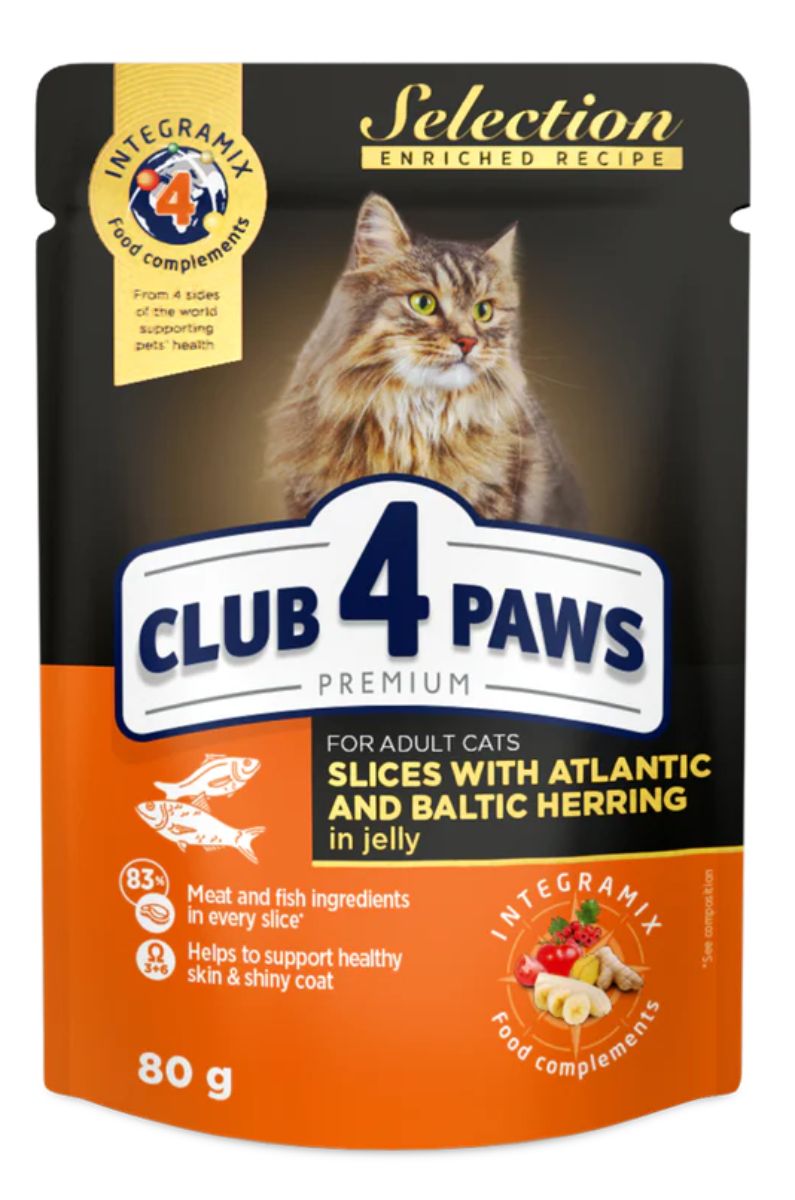 Slices with Atlantic and Baltic Herring in Jelly Club 4 Paws 80гр. - Хапки с Херинга (Атлантическа и Балтийска) в желе. Пълноценна консервирана храна за възрастни котки