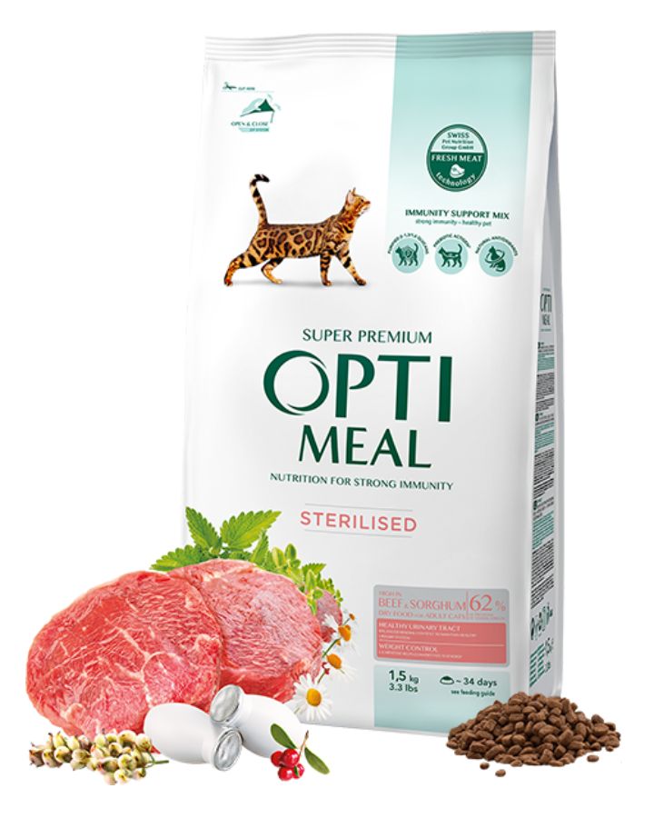 Optimeal Cat Adult Sterilised with Beef and Sorghum 1.5 кг - Пълноценна суха храна за стерилизирани и кастрирани котки - с високо съдържание на говеждо месо и сорго