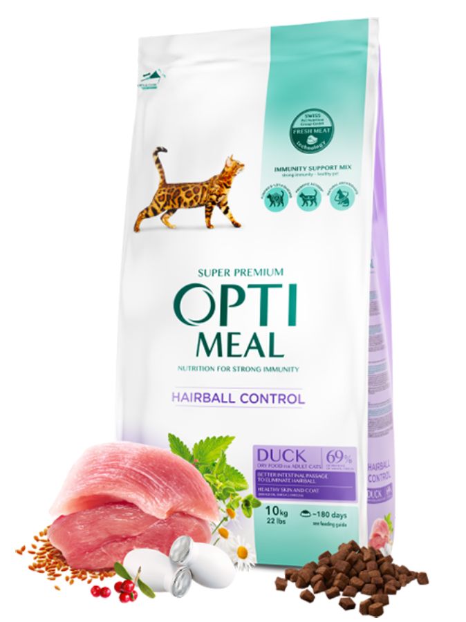 Optimeal Cat Adult Hairball/Duck 10 кг - Пълноценна суха храна с патица, за възрастни котки. За премахване на космени топки от стомаха