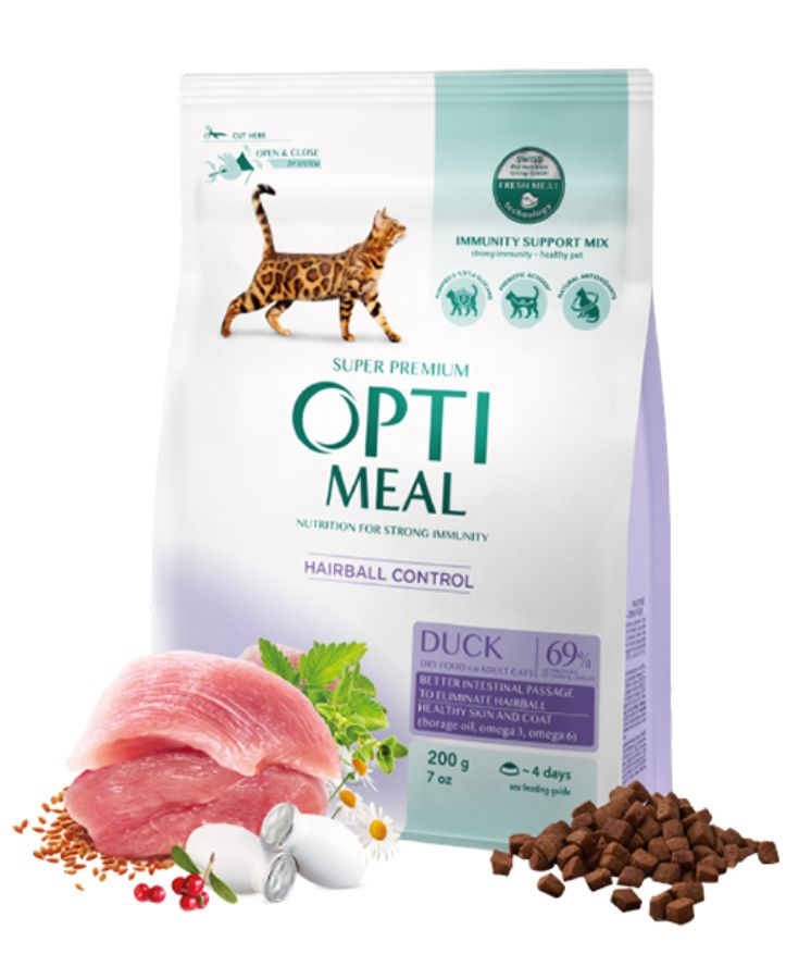Optimeal Cat Adult Hairball/Duck 200 гр. - Пълноценна суха храна с патица, за възрастни котки. За премахване на космени топки от стомаха