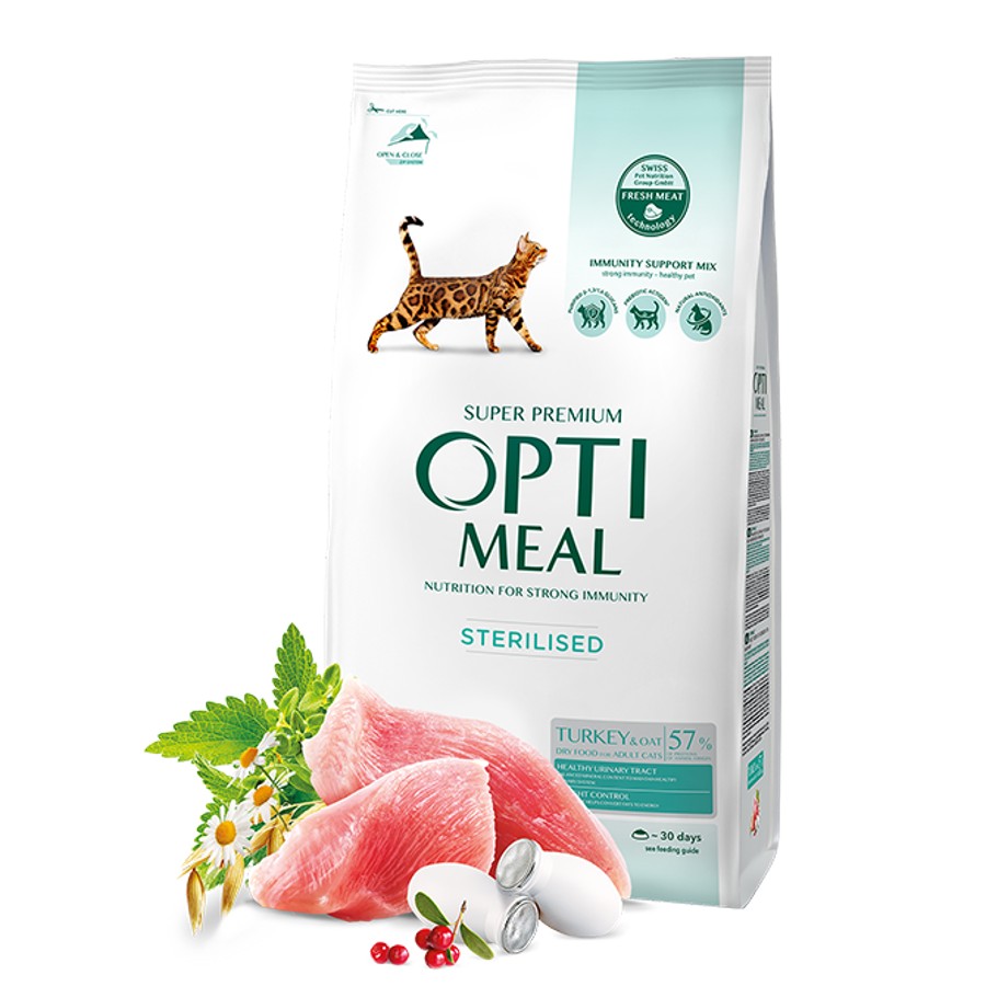 Optimeal Cat Adult Sterilised with Turkey 10 кг - Пълноценна суха храна за стерилизирани и кастрирани котки с пуешко и овес