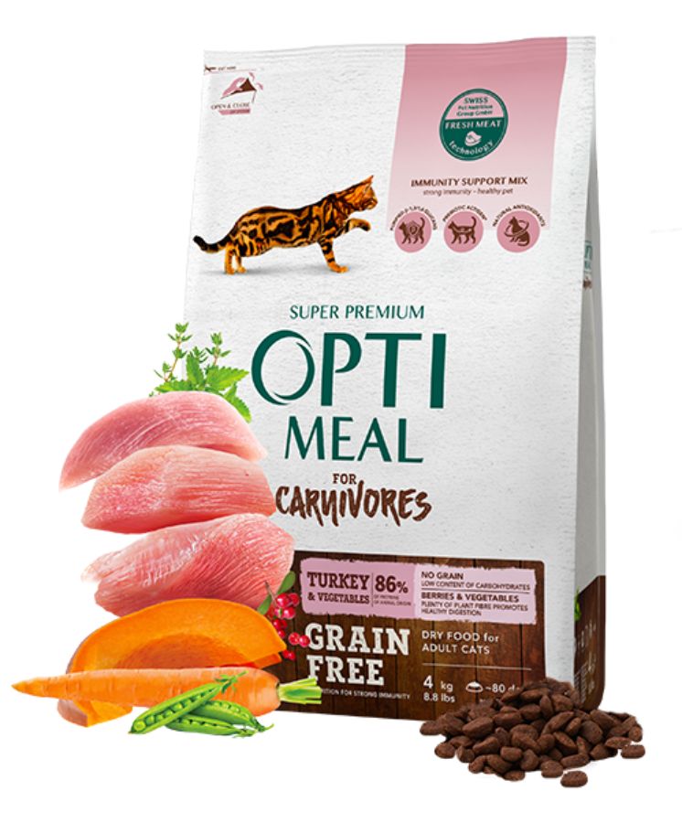 Optimeal Cat Adult Grain Free with Turkey/Vegetables 4 кг - Беззърнена пълноценна суха храна за възрастни котки с пуйка и зеленчуци
